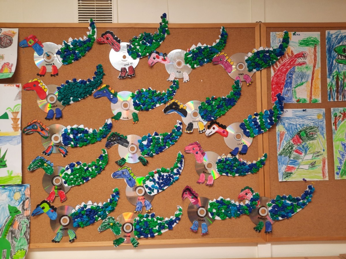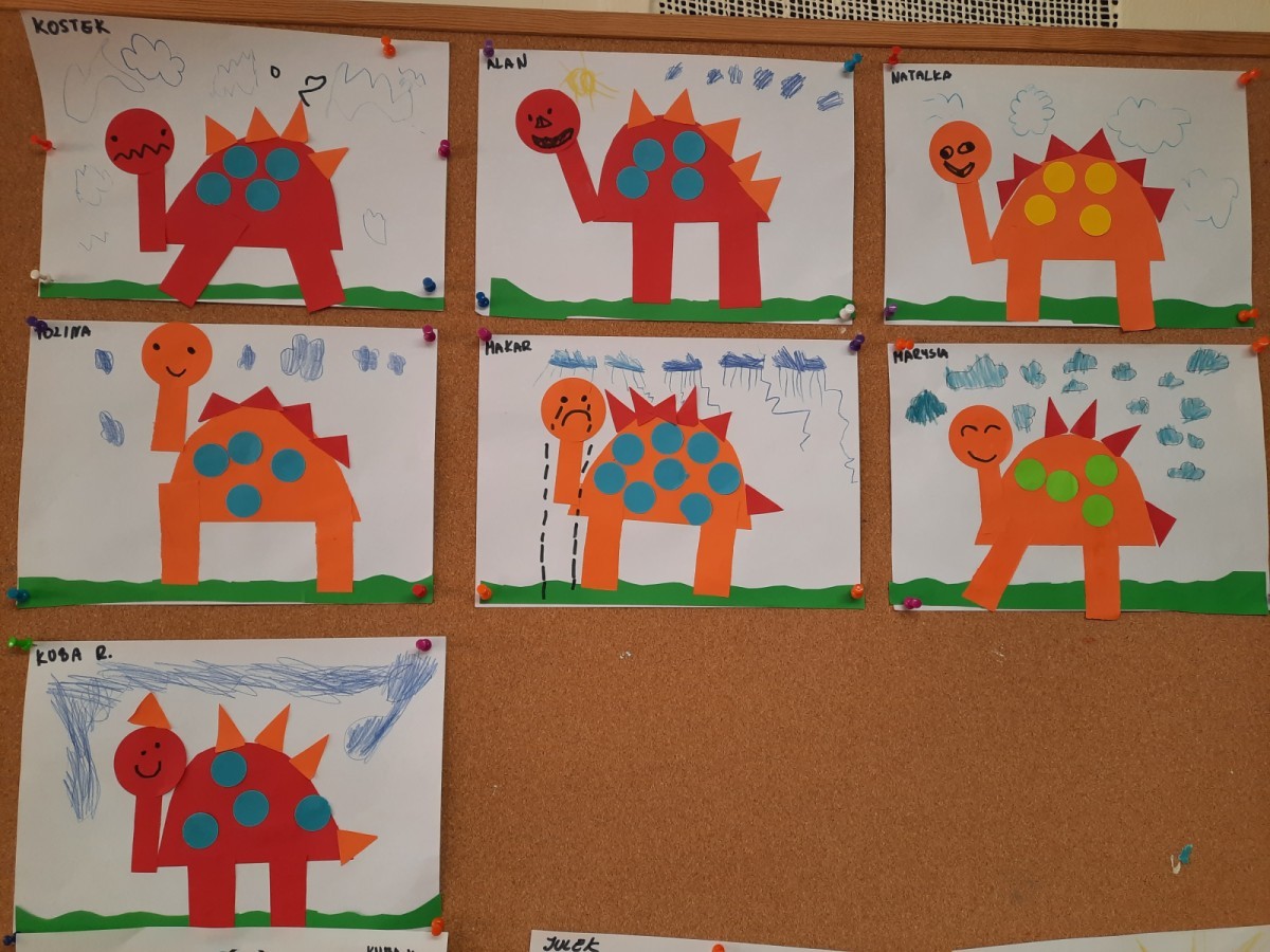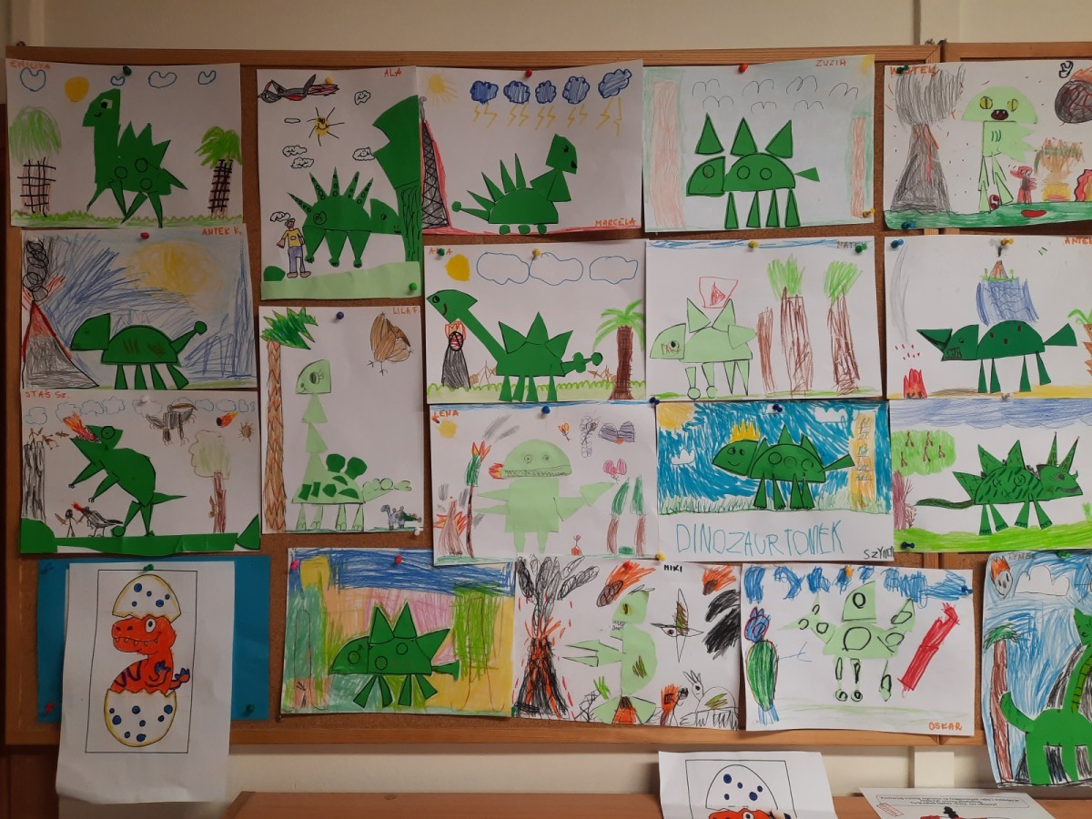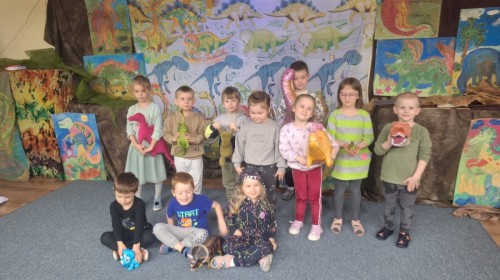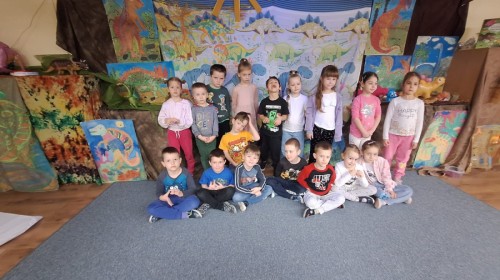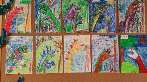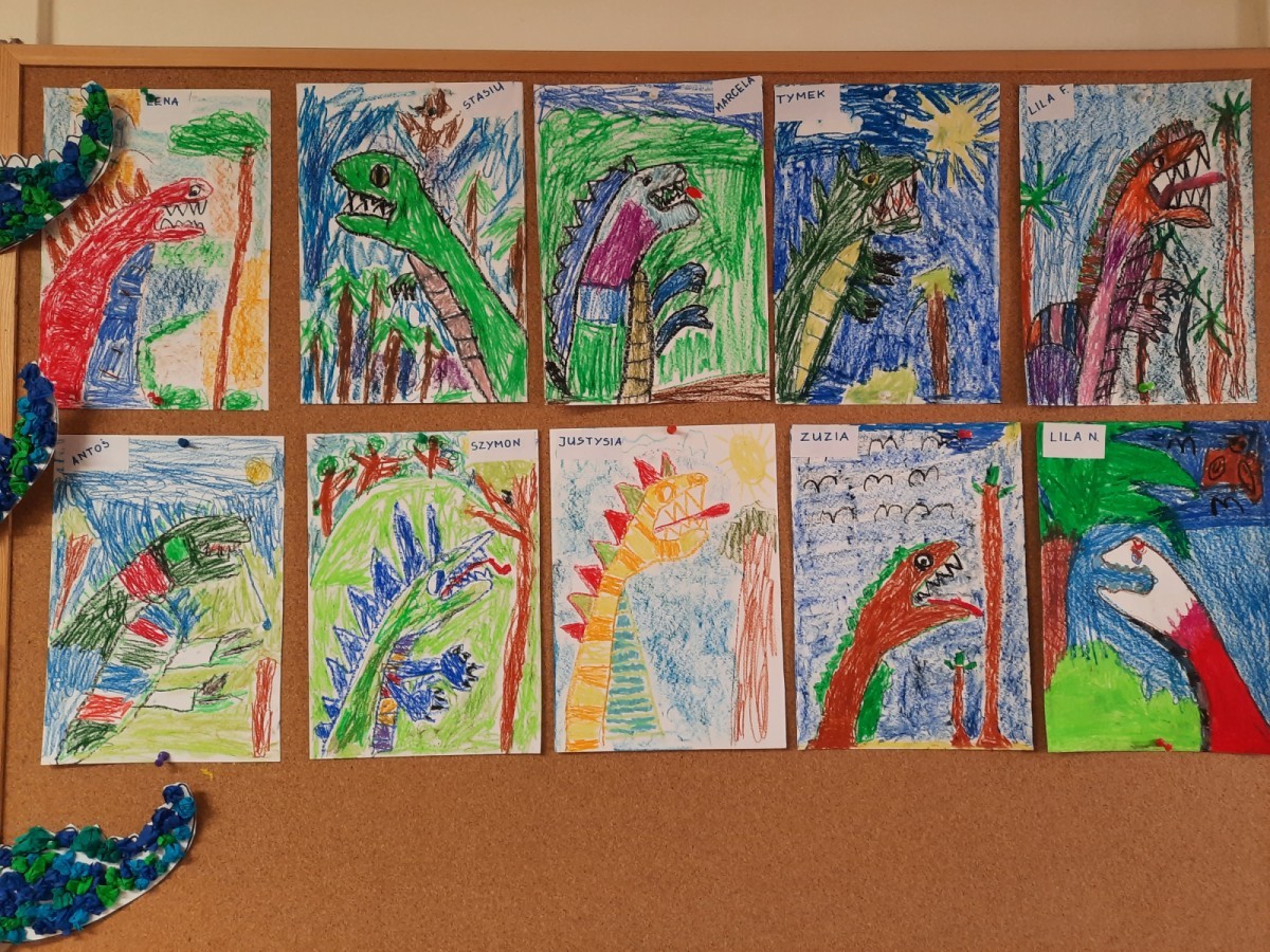 Podczas zajęć plastycznych dzieci z dużym zaangażowaniem wykonywały różnorodne prace przedstawiające dinozaury, wykorzystując różne techniki plastyczne. Nie zabrakło również zabaw ruchowych, muzycznych i edukacyjnych związanych z tematyką tygodnia. Był to czas pełen radości, zabawy i ciekawych odkryć, który rozbudził dziecięcą wyobraźnię i zainteresowanie światem sprzed milionów lat.