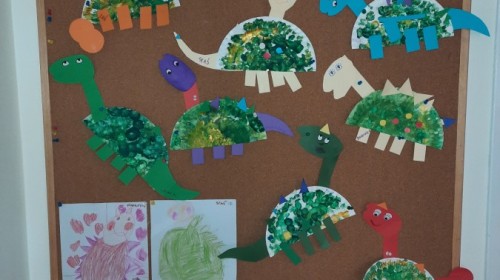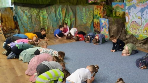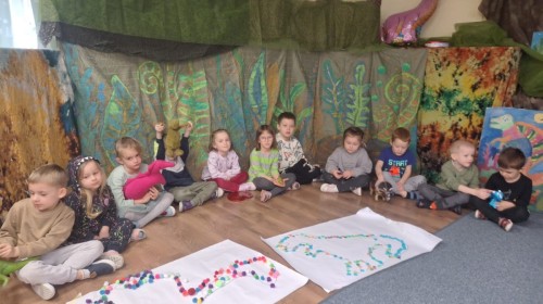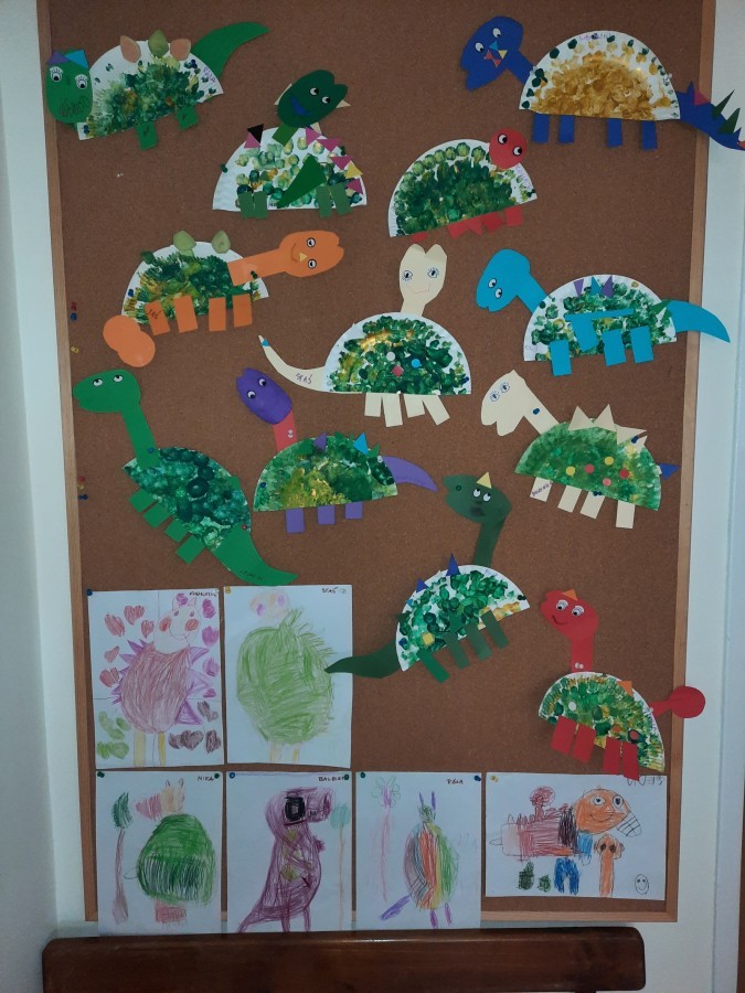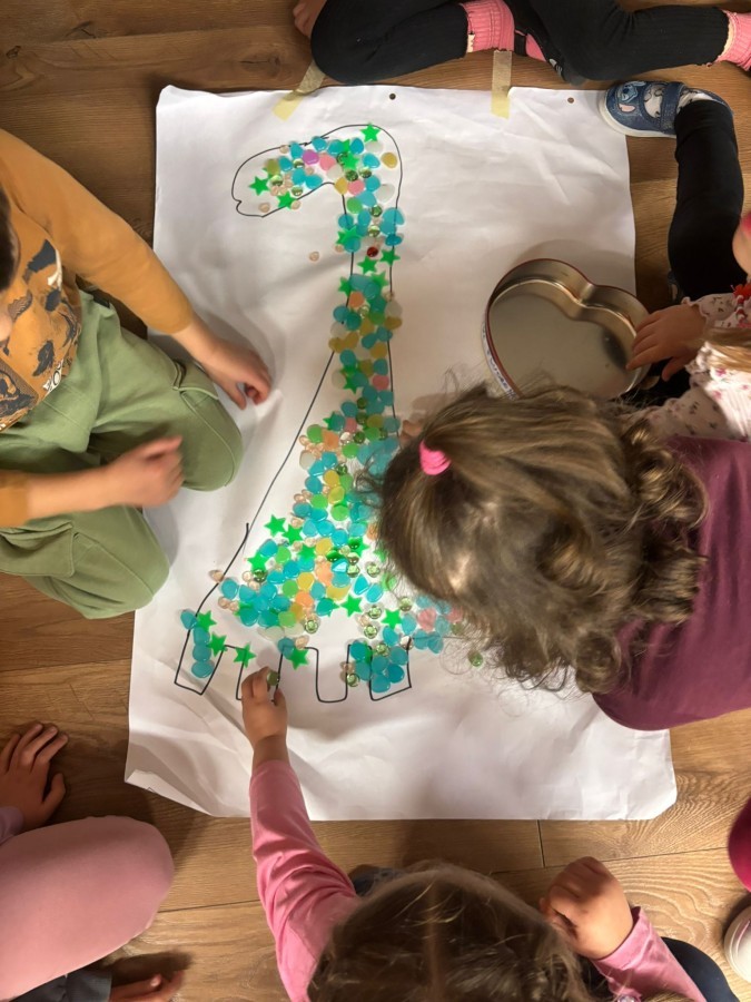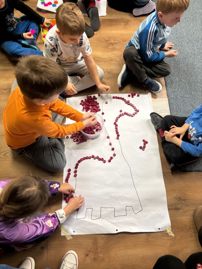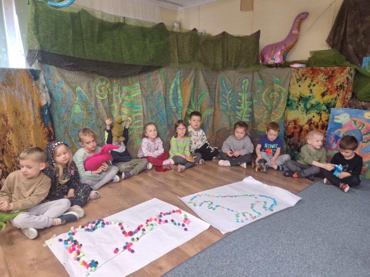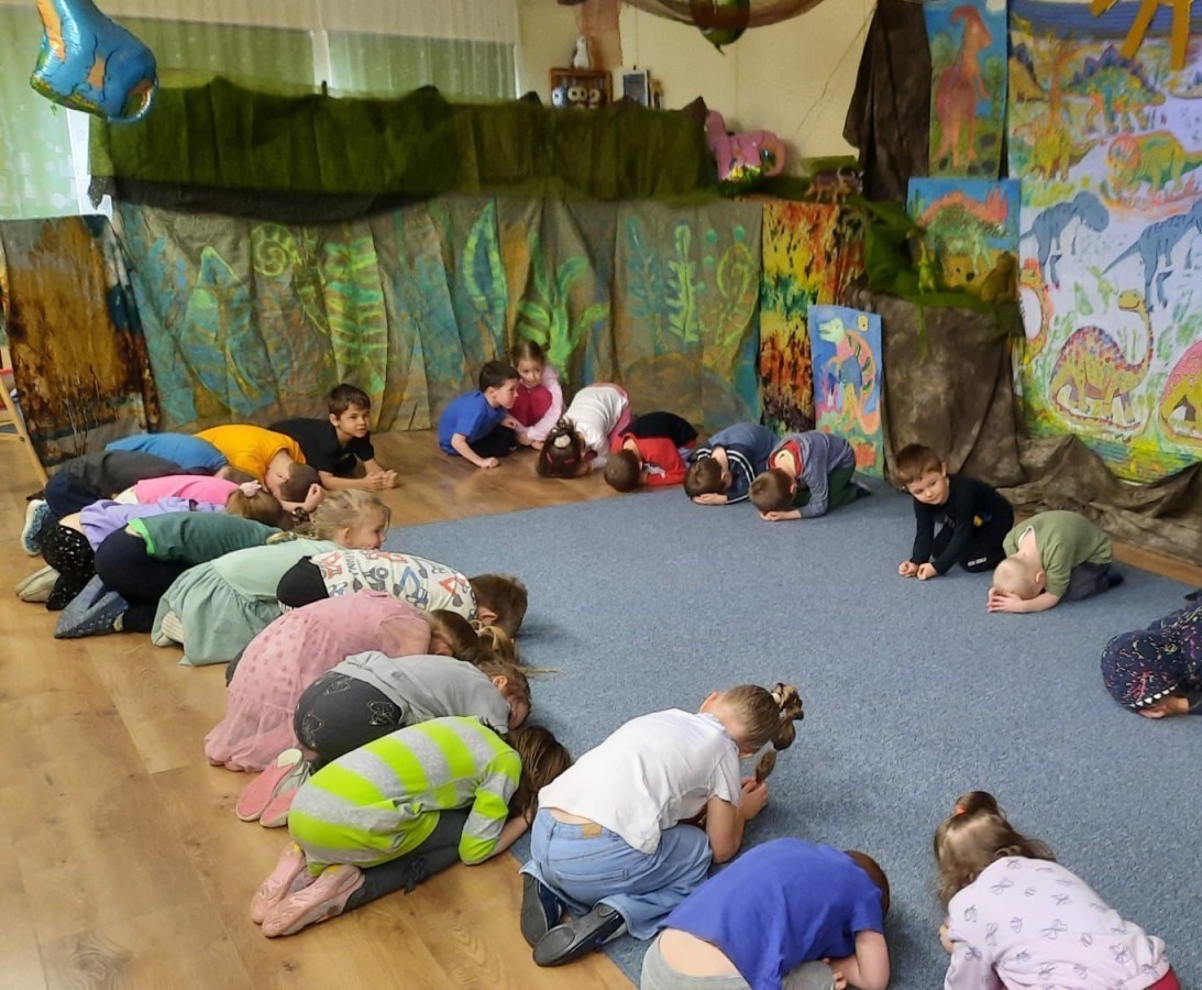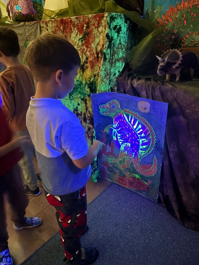 Podczas zajęć plastycznych dzieci z dużym zaangażowaniem wykonywały różnorodne prace przedstawiające dinozaury, wykorzystując różne techniki plastyczne. Nie zabrakło również zabaw ruchowych, muzycznych i edukacyjnych związanych z tematyką tygodnia. Był to czas pełen radości, zabawy i ciekawych odkryć, który rozbudził dziecięcą wyobraźnię i zainteresowanie światem sprzed milionów lat.