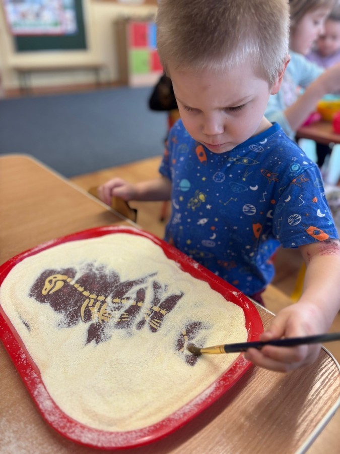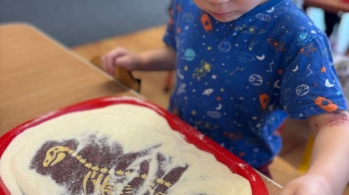 Maluszki poznały także tajniki powstawania wulkanów oraz zamieniły się w małych paleontologów i ruszyły na poszukiwanie skamieniałości - z pomocą pędzli "wykopywały" ukryte w kaszy kości dinozaurów.