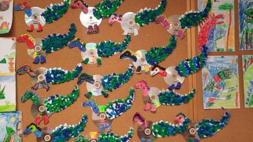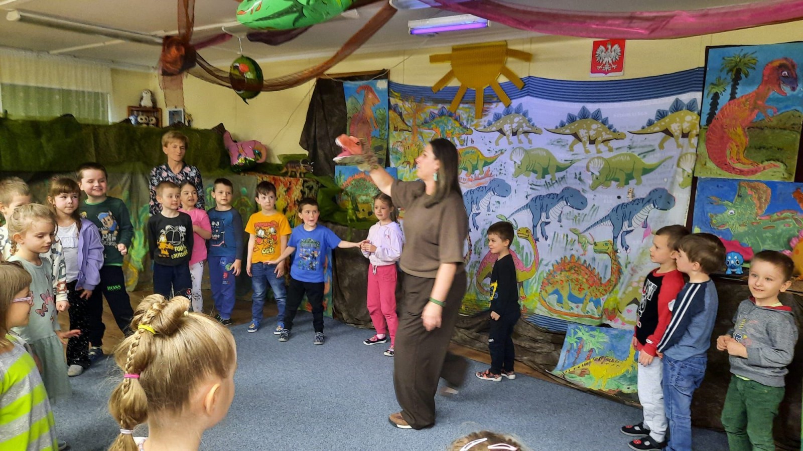 W naszym przedszkolu przez cały tydzień realizowany był temat związany z dinozaurami. Dzieci poznawały ciekawostki o tych prehistorycznych zwierzętach, oglądały ilustracje i książki oraz uczestniczyły w różnych zabawach tematycznych. Przedszkolaki dowiedziały się, jak wyglądało życie dinozaurów, czym się żywiły oraz dlaczego wyginęły.