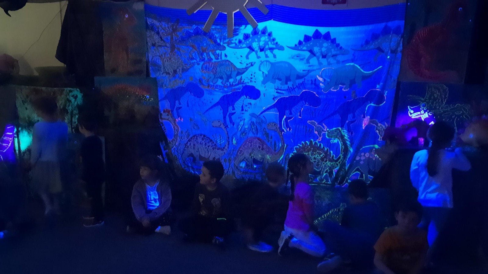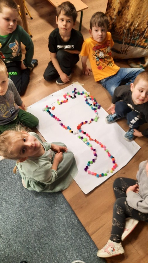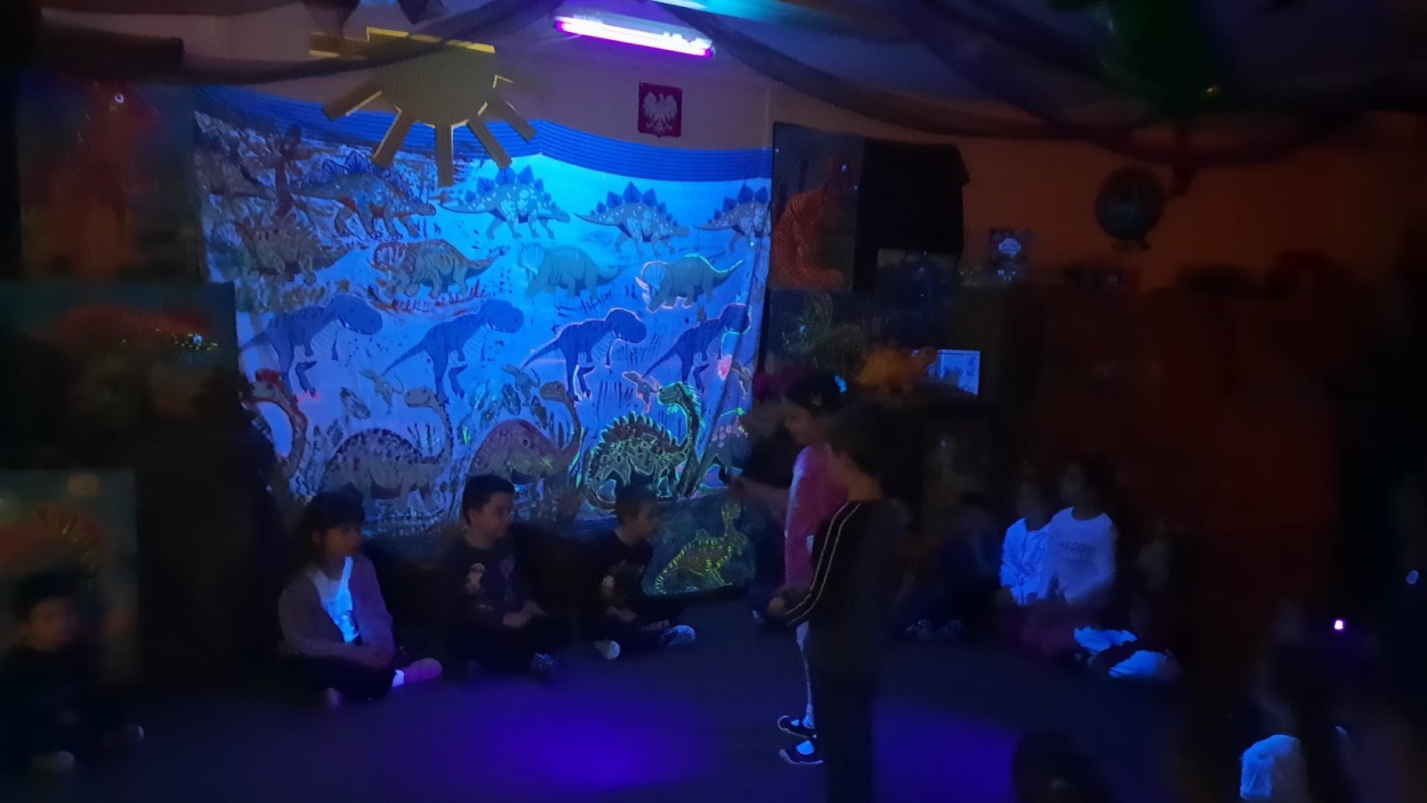 Dzieci z wielkim zainteresowaniem odkrywały świat prehistorycznych zwierząt. Podczas zajęć bawiliśmy się latarkami, które pomagały nam odnajdywać ukryte dinozaury i świecące elementy na obrazkach. Było dużo radości, wspólnego tańca i śpiewu, a także kreatywnej zabawy przy układaniu kolorowych ścieżek. To był dzień pełen ruchu, odkrywania i świetnej zabawy.