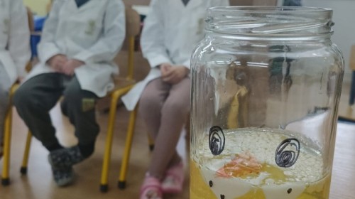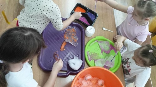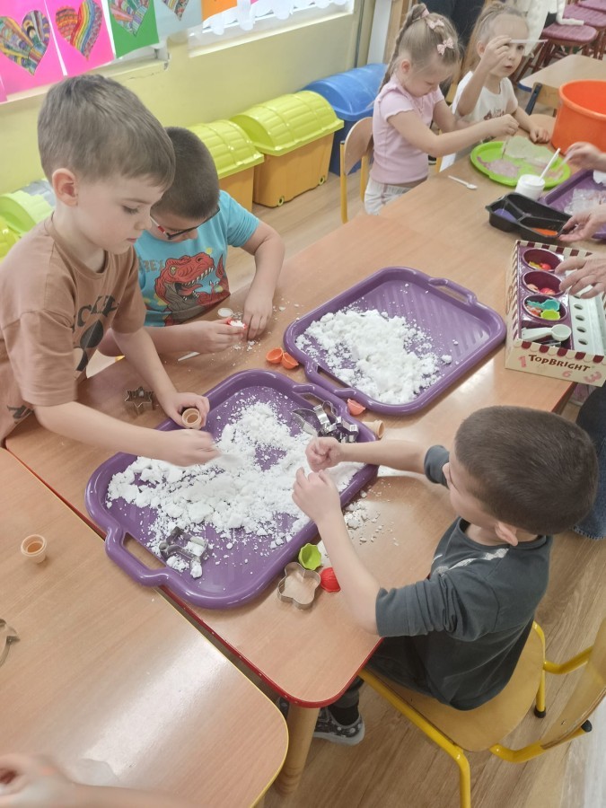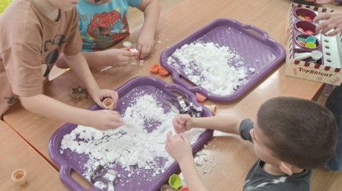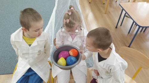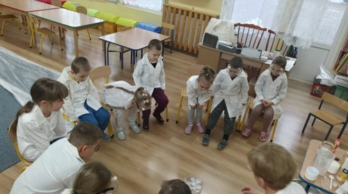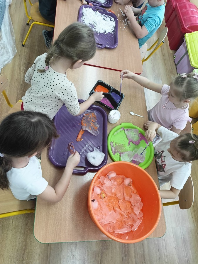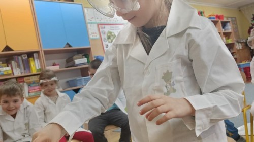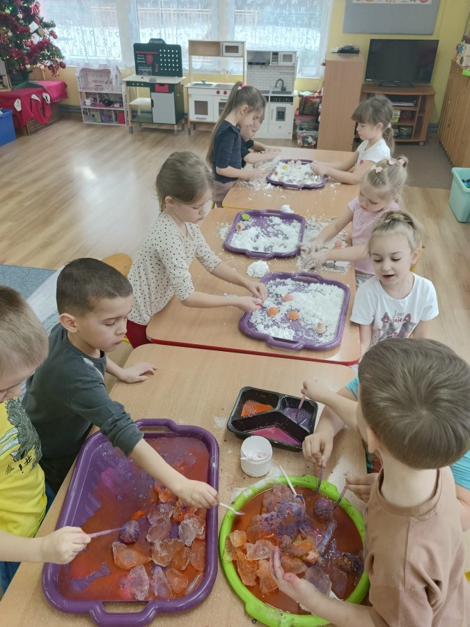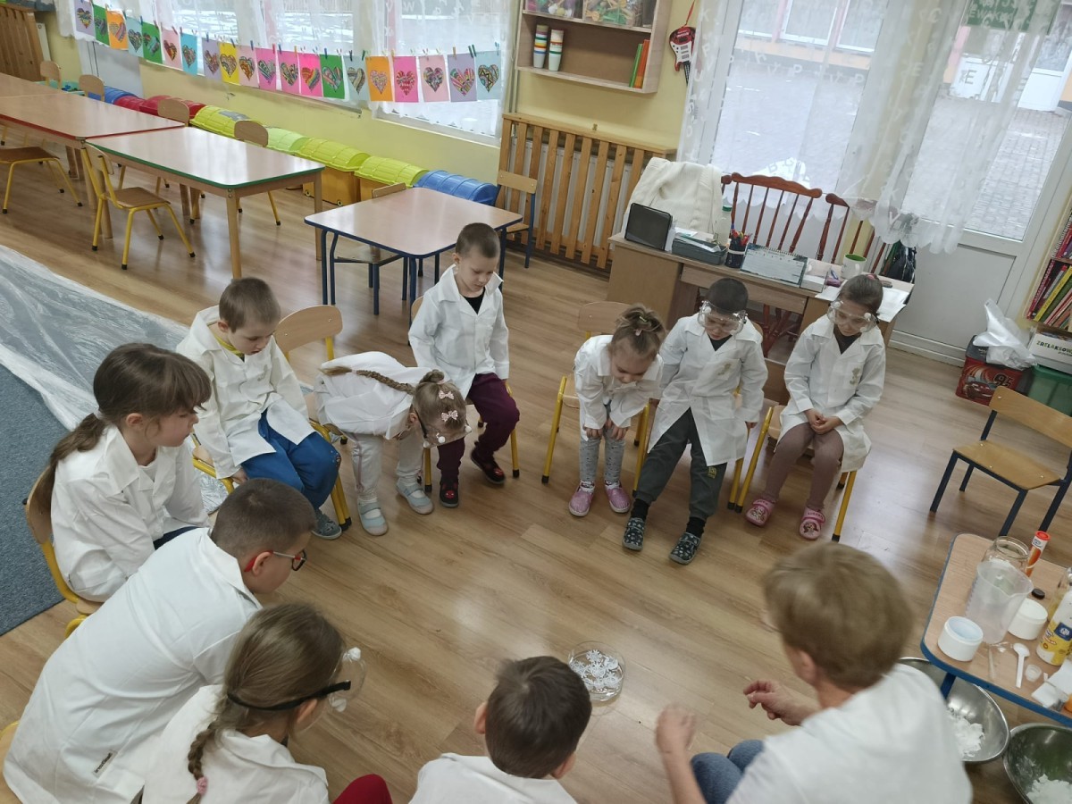 23 stycznia sala Grupy IV zamieniła się w prawdziwe laboratorium inspirowane postacią znanej polskiej uczonej – Marii Skłodowskiej-Curie. W nawiązaniu do tematu „Zimowe odkrycia” dzieci badały śnieg i lód, poznając ich właściwości poprzez ciekawe doświadczenia i obserwacje.