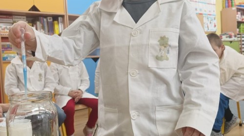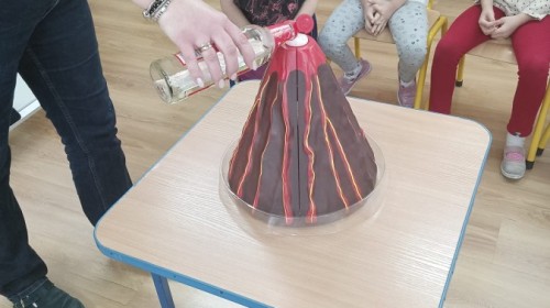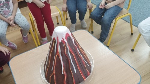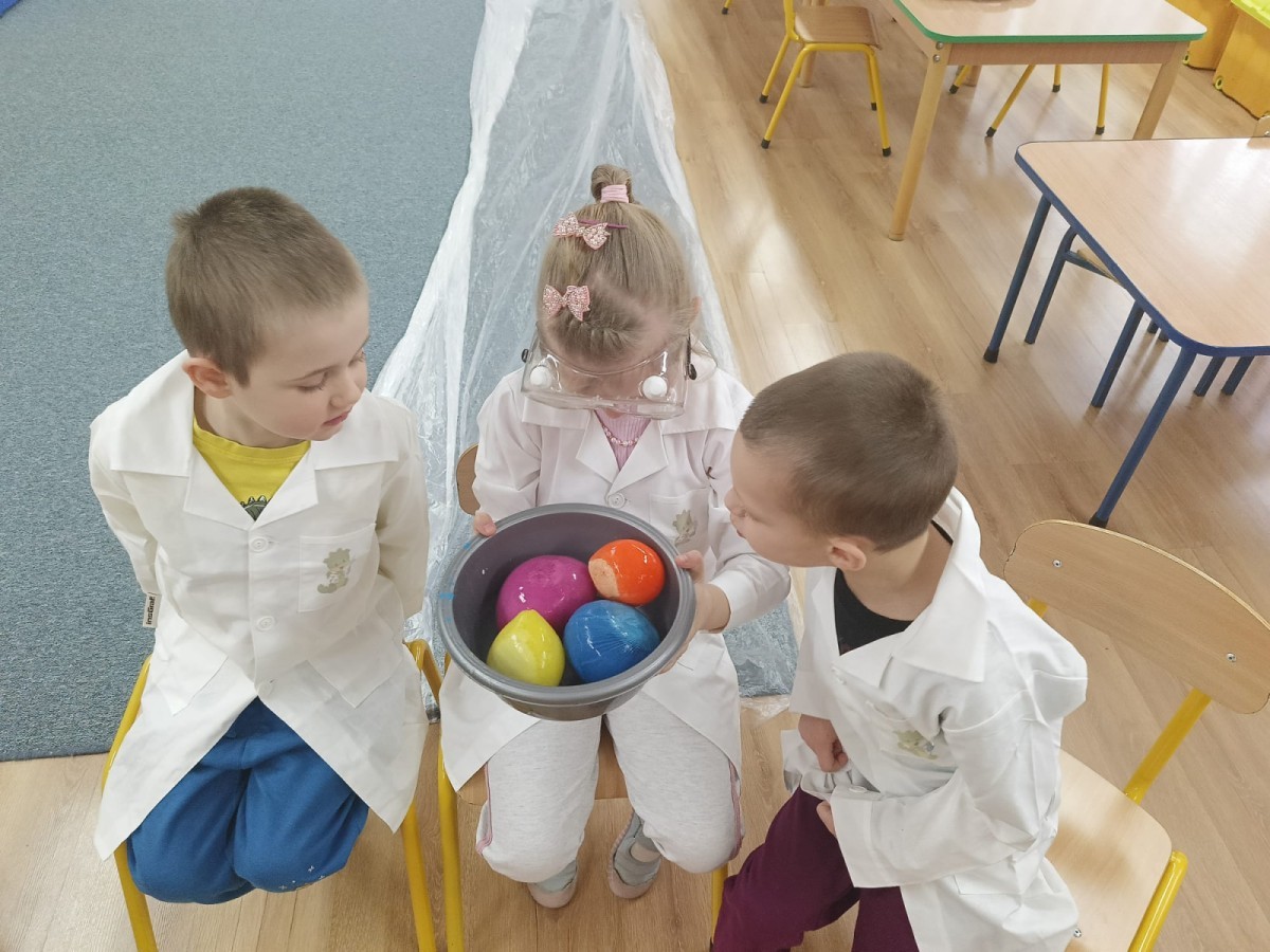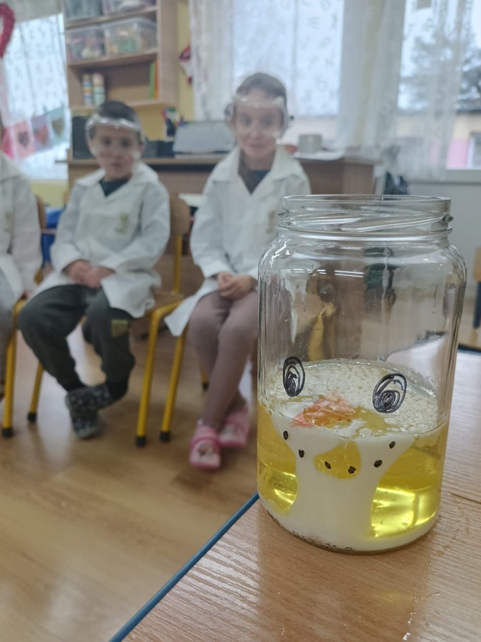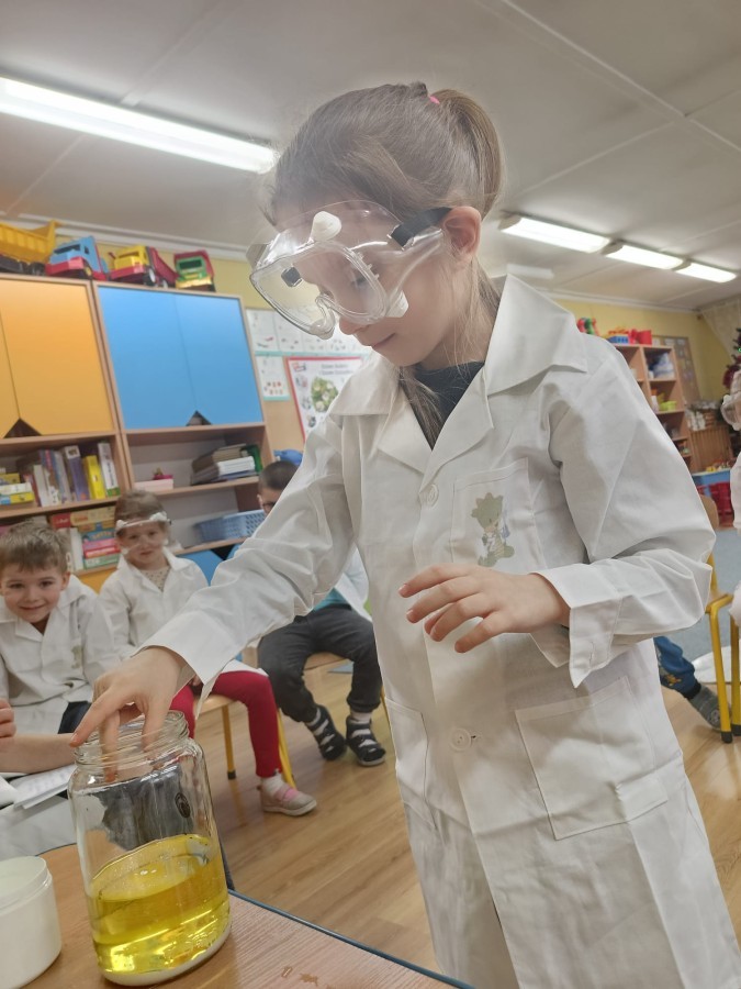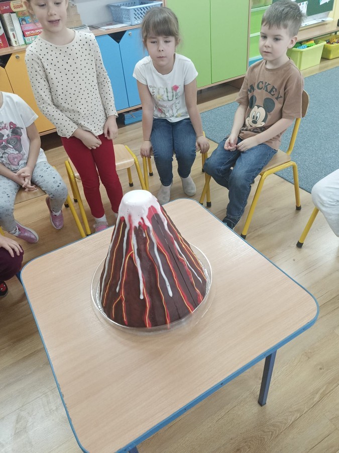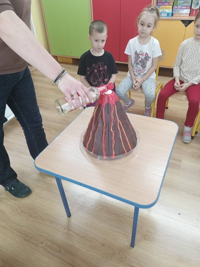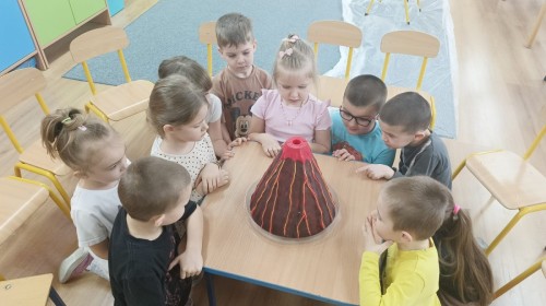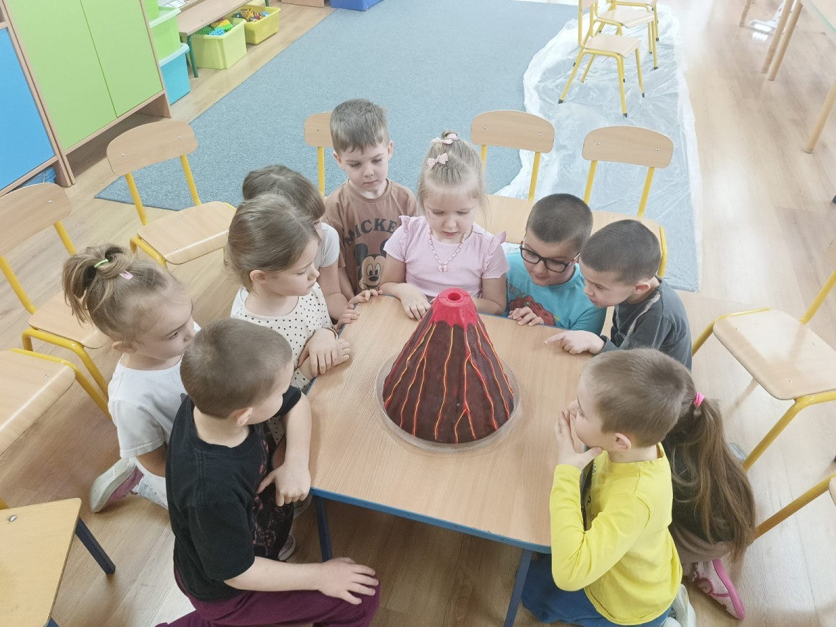 Zajęcia miały na celu wprowadzenie dzieci w fascynujący świat badań naukowych, rozwijanie ciekawości, samodzielnego myślenia oraz umiejętności zadawania pytań. Przedszkolaki z ogromnym zaangażowaniem wcieliły się w rolę małych badaczy, a nauka przez zabawę sprawiła im wiele radości. Na zakończenie zajęć, w nagrodę za aktywny udział w zajęciach, dzieci obejrzały efektowną „erupcję wulkanu”, która wywołała mnóstwo emocji i zachwytu. To był dzień pełen odkryć, eksperymentów i niezapomnianych wrażeń.