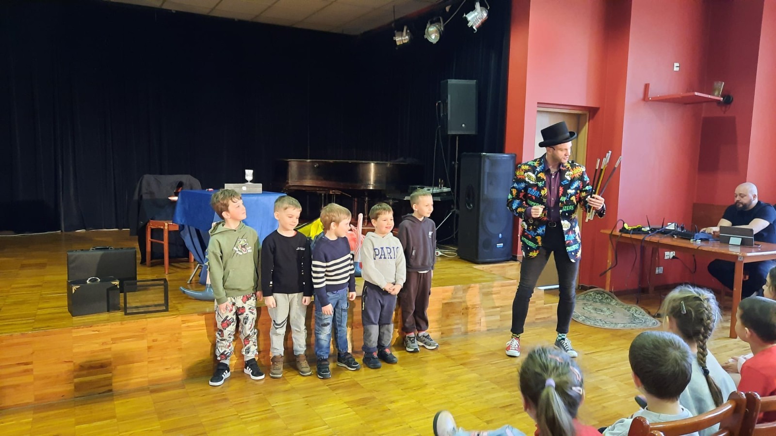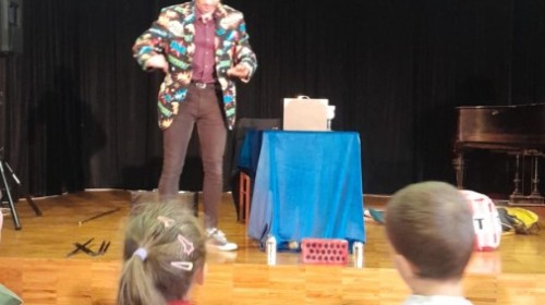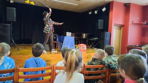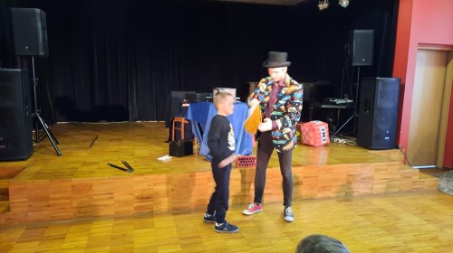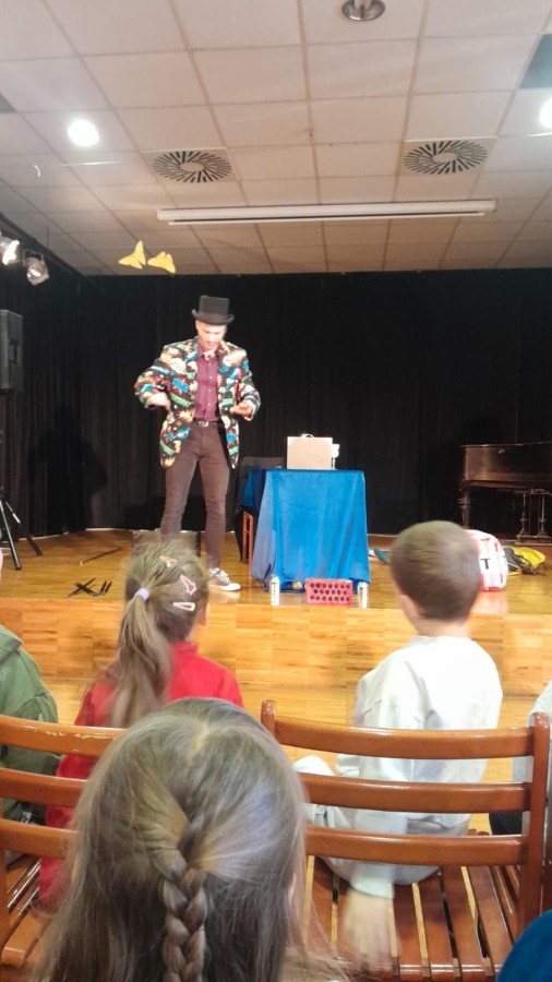 W dniu dzisiejszym przedszkolaki uczestniczyły w spotkaniu z iluzjonistą, które wzbudziło ogromne emocje wśród dzieci. Już od pierwszych chwil na sali panowała atmosfera radości i zaciekawienia. Magik, ubrany w kolorową marynarkę i charakterystyczny kapelusz, przyciągał uwagę swoją energią i poczuciem humoru. Podczas występu dzieci miały okazję zobaczyć wiele niezwykłych sztuczek. Iluzjonista wyczarowywał przedmioty znikąd, sprawiał, że rzeczy znikały, a następnie pojawiały się w zupełnie innym miejscu. Szczególne zainteresowanie wzbudziły sztuczki z udziałem rekwizytów oraz magicznych pudełek.Największą atrakcją dla przedszkolaków była możliwość aktywnego udziału w pokazie. Wybrane dzieci mogły wejść na scenę i pomóc w wykonywaniu trików, co sprawiło im ogromną radość i było dla nich niezapomnianym przeżyciem. Wspólna zabawa wywoływała wiele śmiechu i spontanicznych reakcji. Spotkanie z iluzjonistą nie tylko dostarczyło dzieciom rozrywki, ale również pobudziło ich wyobraźnię i ciekawość świata. Było to niezwykle udane wydarzenie, które na długo pozostanie w pamięci wszystkich uczestników.
