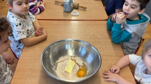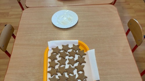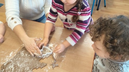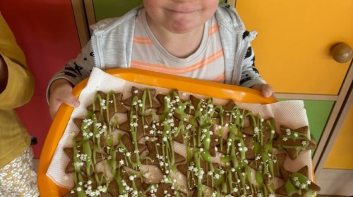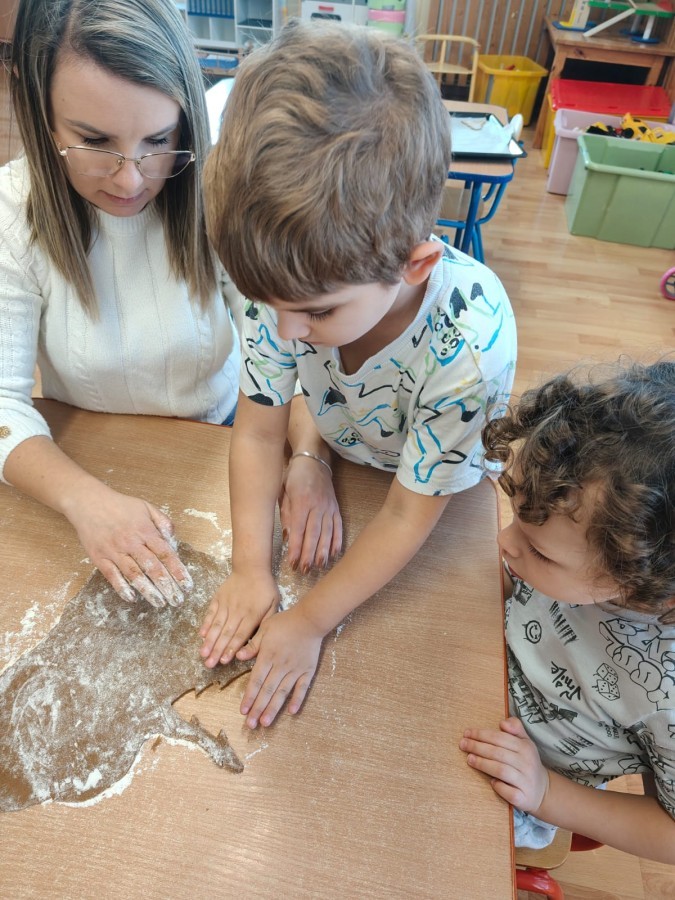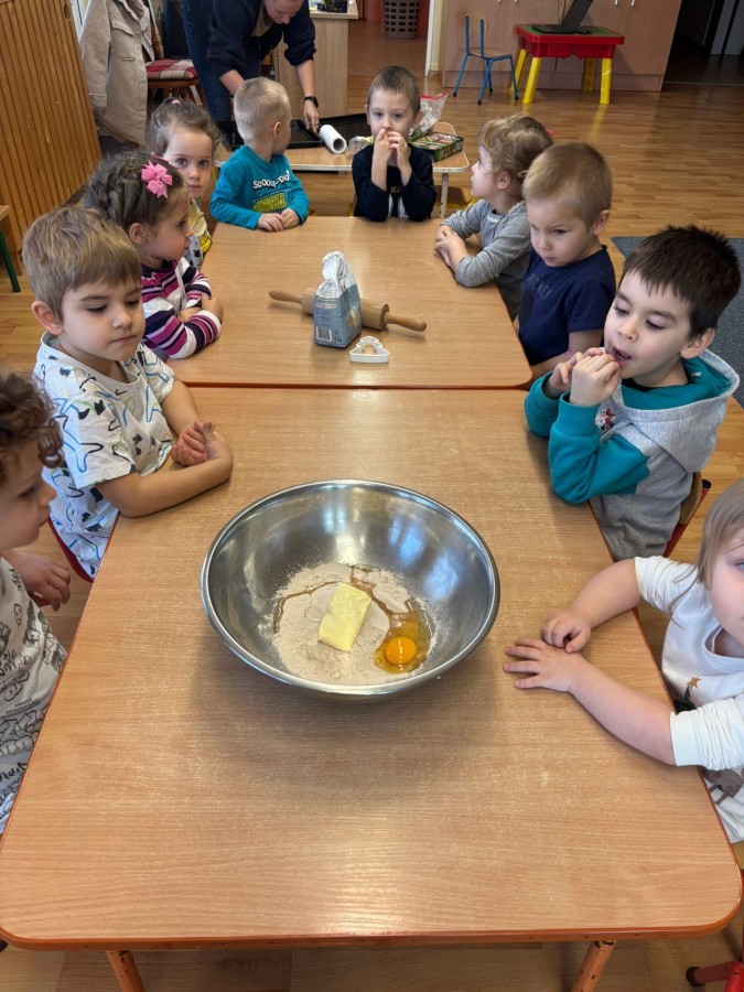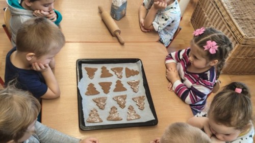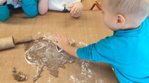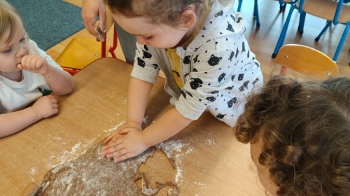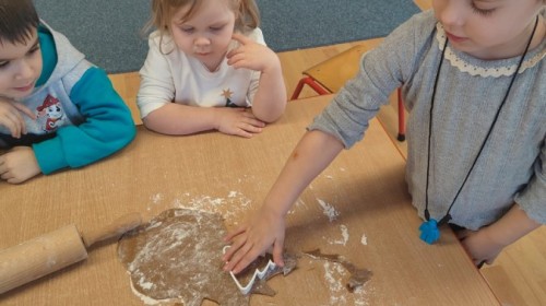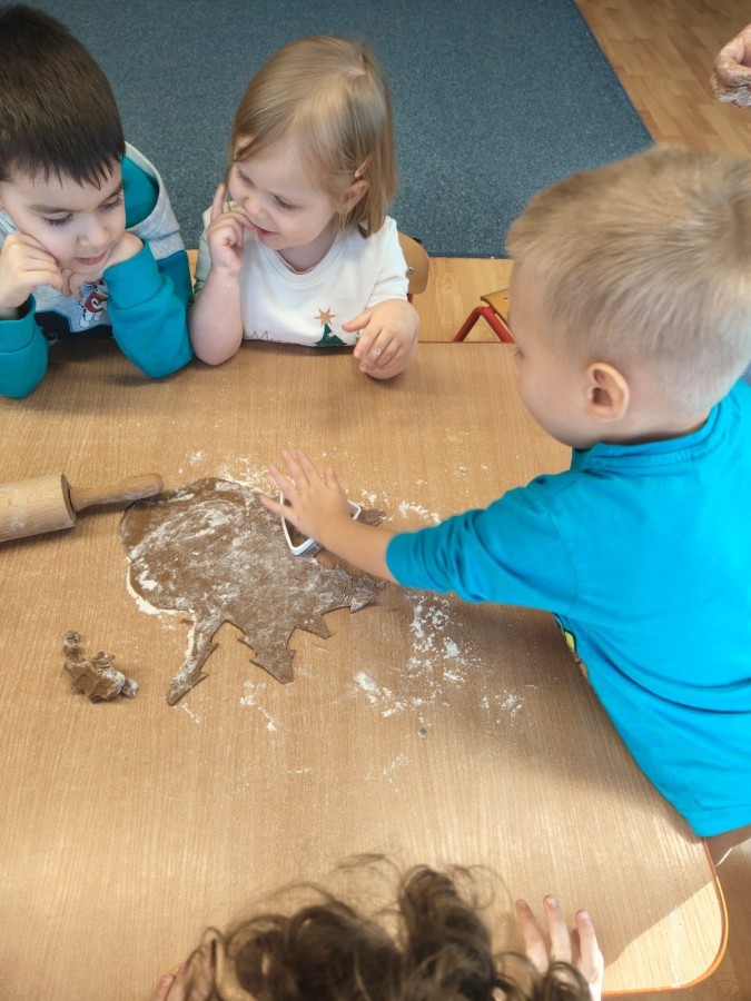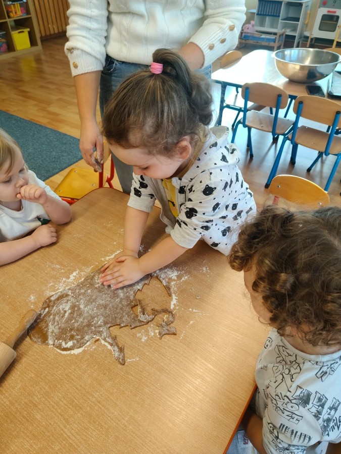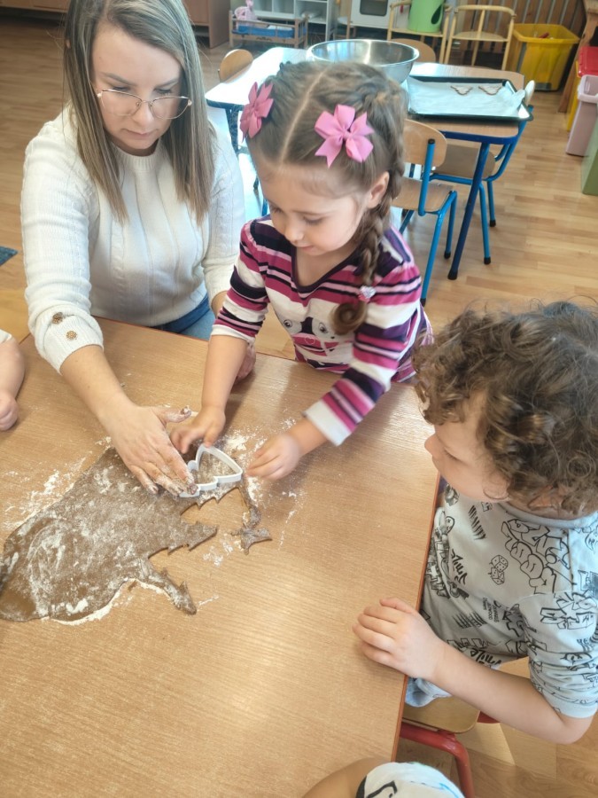 W grupie najmłodszej odbyły się zajęcia kulinarne, podczas których dzieci wspólnie wypiekały i ozdabiały aromatyczne pierniczki. Maluchy z wielkim zaangażowaniem i pomocą pań wałkowały ciasto, wykrawały kształty i dekorowały ciasteczka kolorowymi lukrami i posypkami.