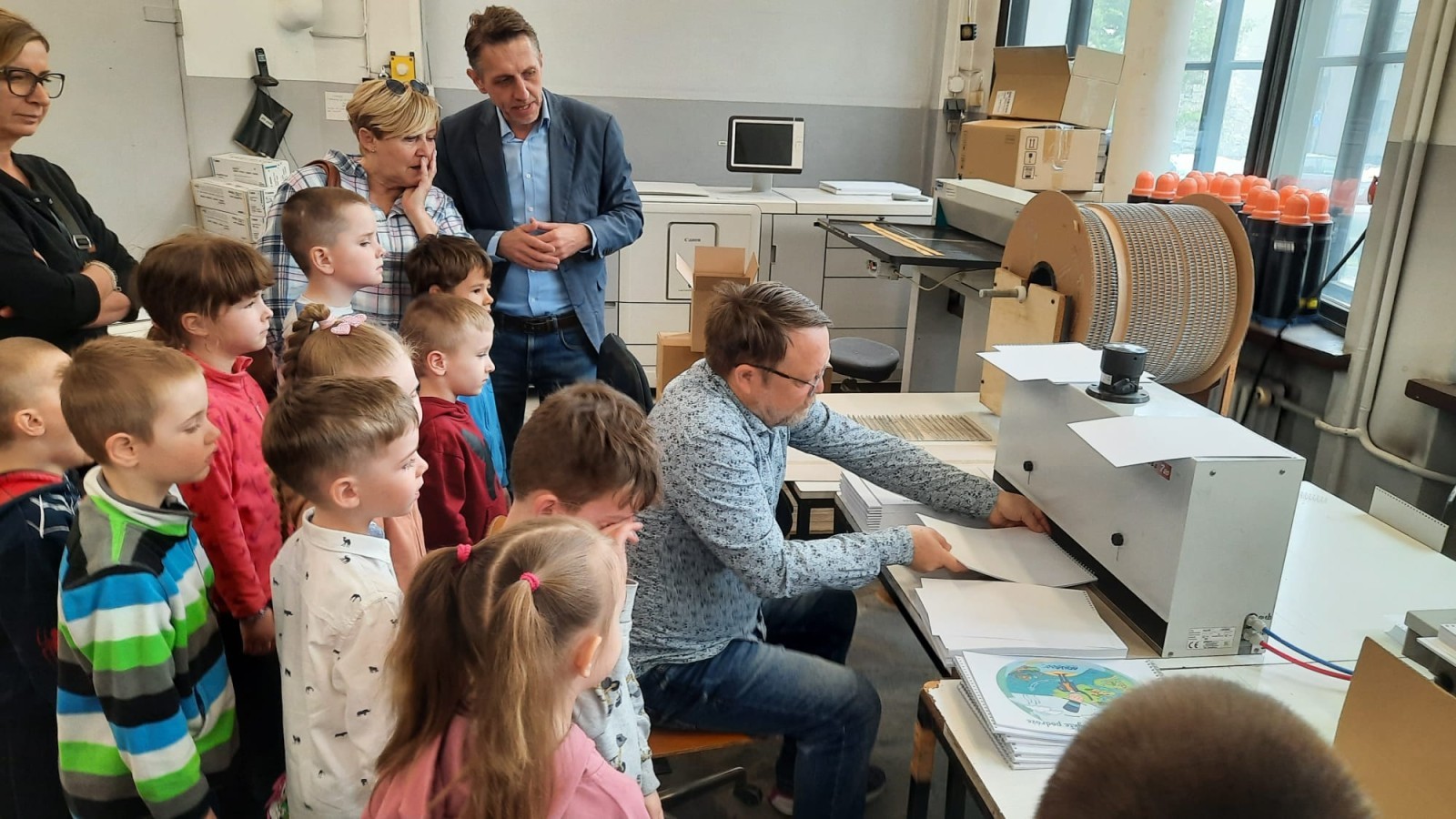 Pracownicy drukarni z ogromnym zaangażowaniem i życzliwością opowiadali o swojej pracy, prezentując kolejne etapy produkcji. Dzieci z zainteresowaniem obserwowały działanie maszyn oraz dowiedziały się, jak ważna jest precyzja i współpraca na każdym etapie tworzenia książek.