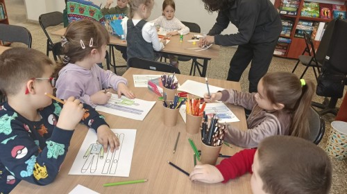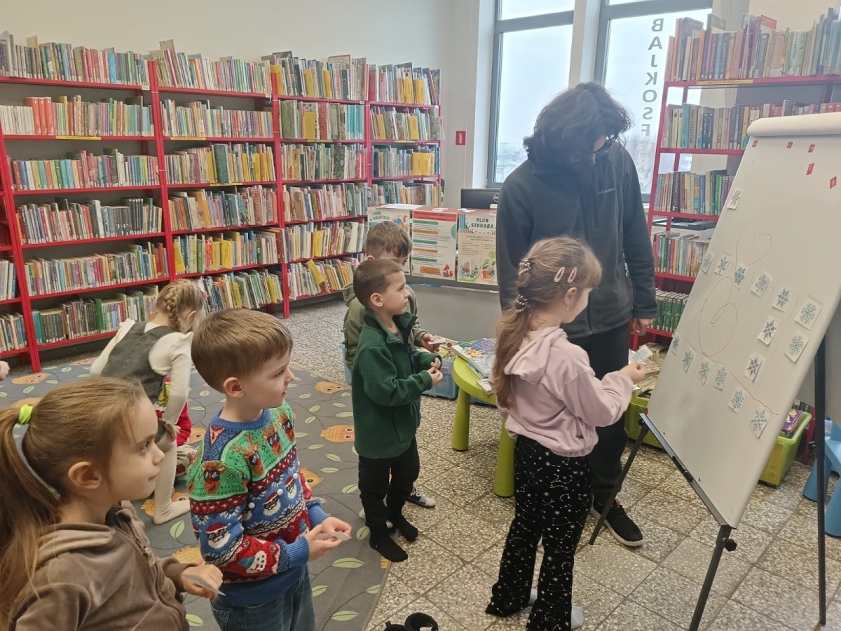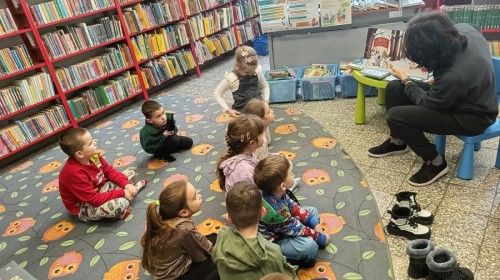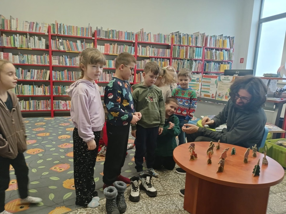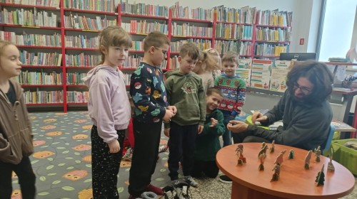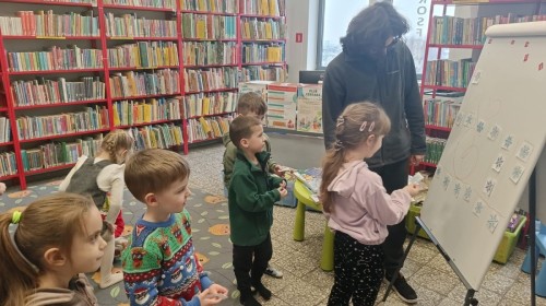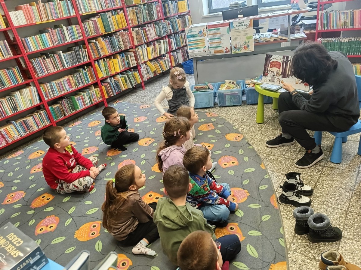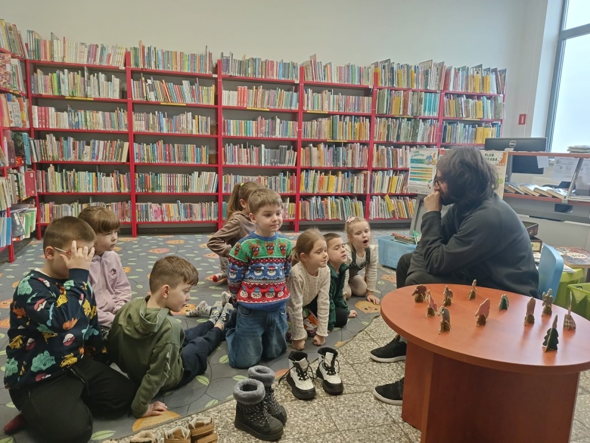 W ramach cyklicznych wyjść Grupa IV odwiedziła bibliotekę osiedlową. Dzieci z dużym zainteresowaniem wysłuchały opowiadania pt. „Zimowe zawody”, które przeczytał pan bibliotekarz. Następnie przedszkolaki brały udział w grze planszowej o zwierzętach mieszkających w lesie oraz w zabawie dydaktycznej „Czego brakuje?”, podczas której odgadywały, jakich zwierząt brakuje na stole.