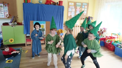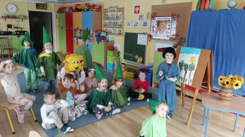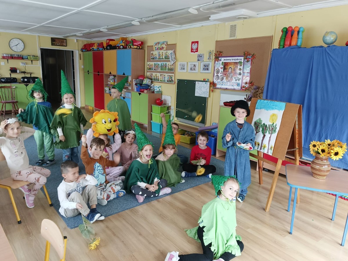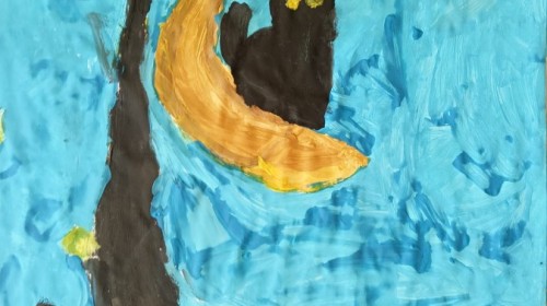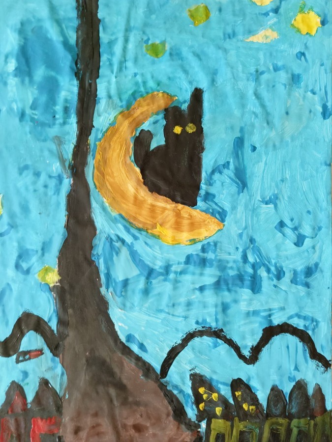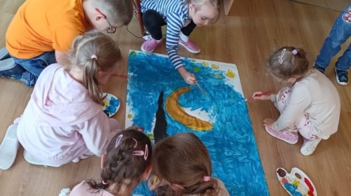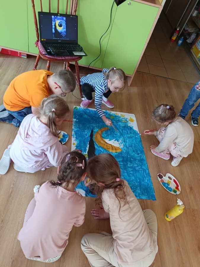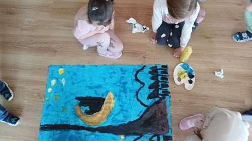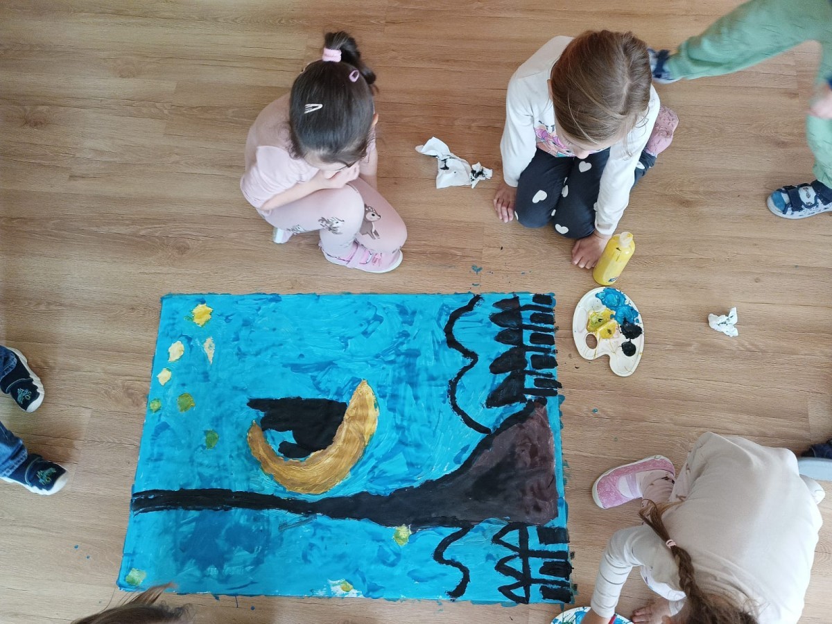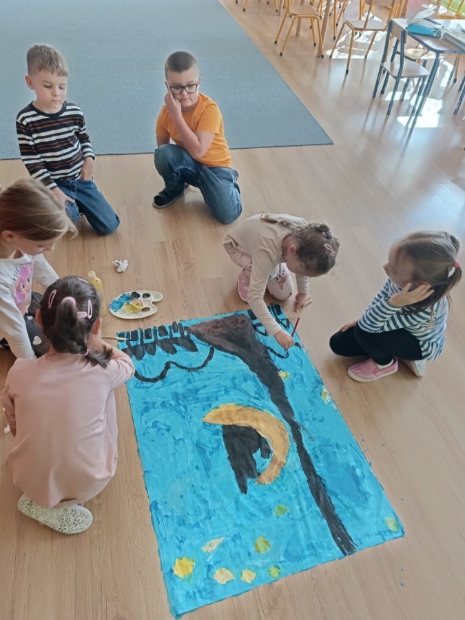 W październiku Grupa IV wykonała jedno z zadań projektu edukacyjnego pt. „Zabawa sztuką”. Podczas realizacji zadania powstała inscenizacja „Wszyscy jesteśmy Van Goghami”. Dzieci wspólnie wykonały reprodukcję obrazu inspirowanego „Gwiaździstą nocą” jednym z najsłynniejszych dzieł Vincenta Van Gogha.